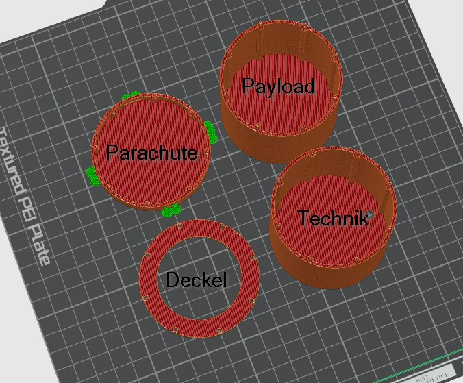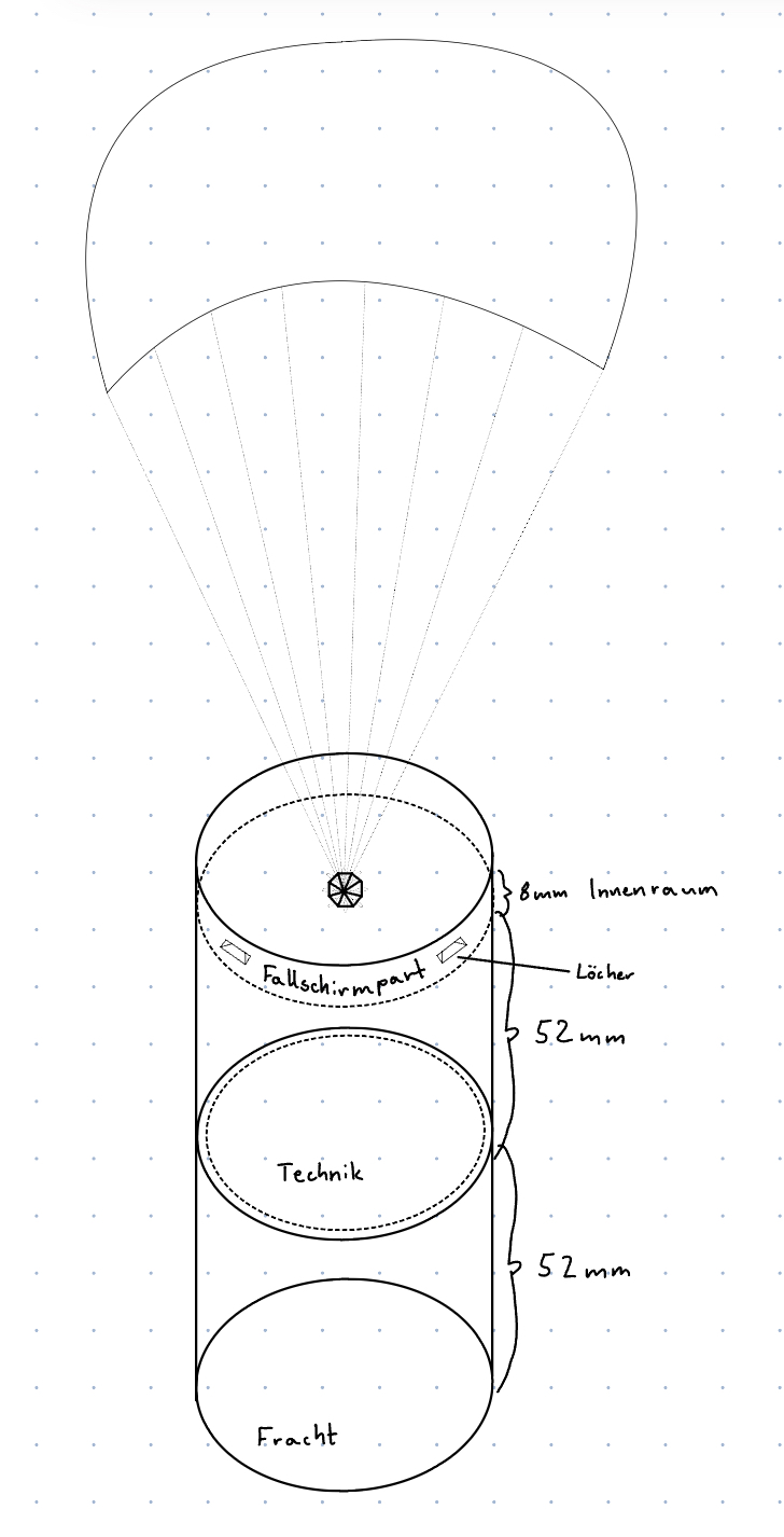 Ein Arduino wird programmiert.Das Design unserer Team-pulloverUnser in Schaumstoff eingepackte Schaumstoff.Blenderdesign unserer AußenhüleUnsere Außenhülle, in die die Technik und Fracht eingelassen wird.Die technische Zeichnung unserer Dose inklusive Fallschirm.